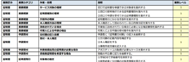 この業務一覧表は、業務の標準化はもちろん、OJTや研修に活用することで人材育成にもつながります。